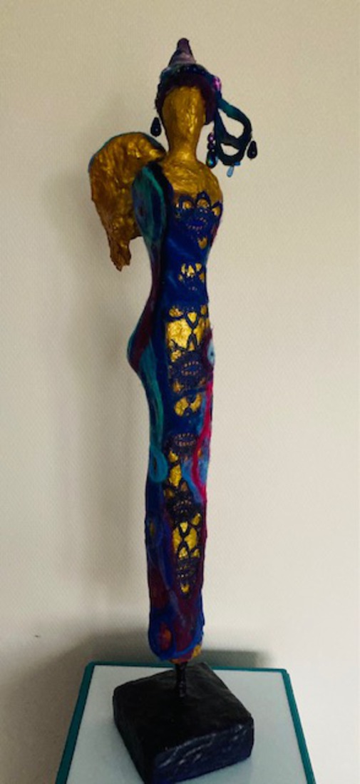 Hoe voel je je tijdens deze crisis en als de lockdown een feit is .... eerst voelde ik mij een soort van vleugellam , vervolgens ging ik gelukkig toch weer nieuwe ideeën ontwikkelen ik leerde vilten. Van kunsthars maakte ik dit figuur die ik bewerkte met goudpoeder. Daar omheen heb ik gevilt en er kralen in verwerkt.