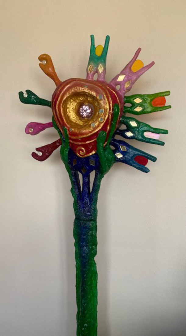 Een beeld met sokkel voor op een balkon . In het midden een kristal en daaromheen spiegeltjes .